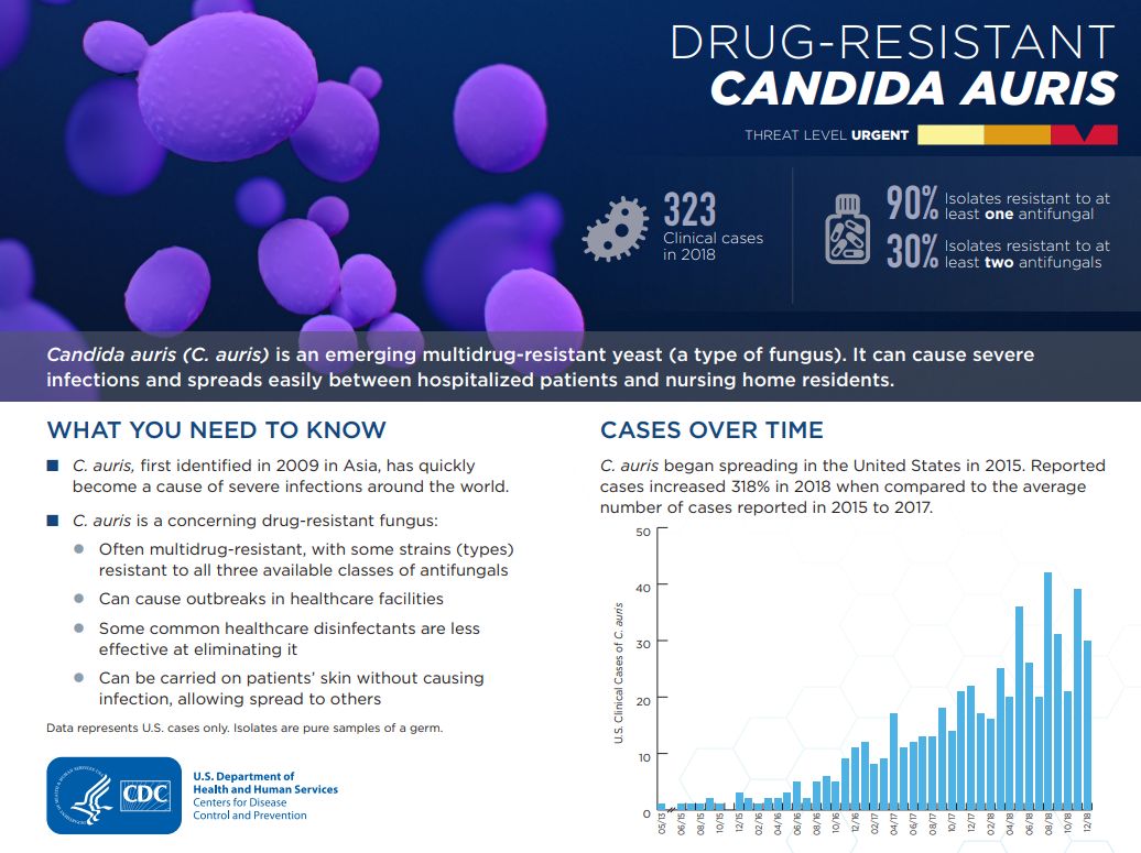 3) Candida auris는 전세계적인 위협으로 떠오르고 있는 감염균으로 특히 다제내성 곰팡이의 대표주자입니다. 다제내성이란 여러 약제에 내성을 보인다는 뜻으로 다제내성 세균을 보통 "슈퍼박테리아"라고 부르는데, 그런 의미에서 "슈퍼 곰팡이 (super fungus)"라고도 부릅니다. 캔디다 오리스는 흥미롭게도 세계 최초로 한국에서 발견되었지만, 전세계적으로 퍼져있는 yeast 타입 진균입니다.