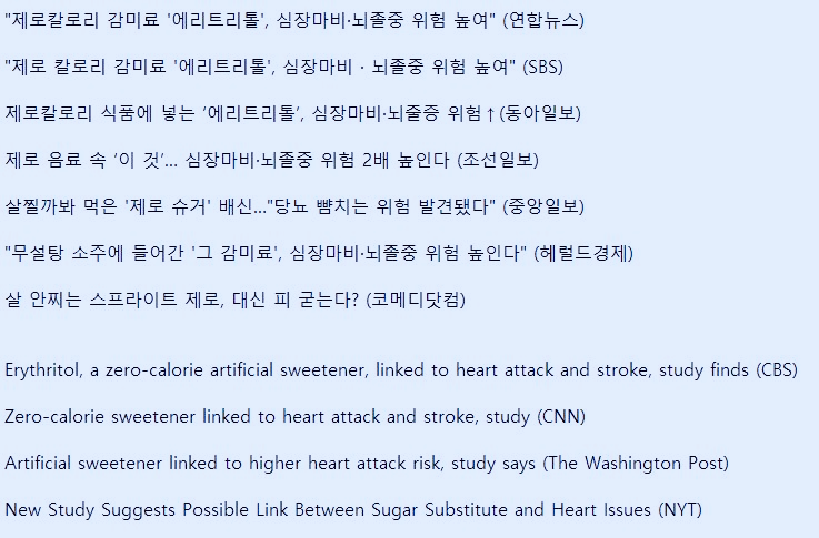 이런 기사가 나올 때마다 국내 언론과 외국 언론의 보도 제목과 해석이 꽤 다릅니다. 제가 입아프게 강조해 왔지만 데이터와 해석을 막 섞어버리면 안됩니다. "데이터는 정확하게, 해석은 신중하게" 다뤄야 합니다. 하지만 우리 언론에서는 에리트리톨이 심혈관계 질환을 "높인다"는 식으로 제목을 붙입니다. 반면에 외국 언론에서는 "관련이 있다 (link)" 정도로 이야기합니다. 별 것 아닌 것 같지만 저는 큰 차이라고 생각합니다.