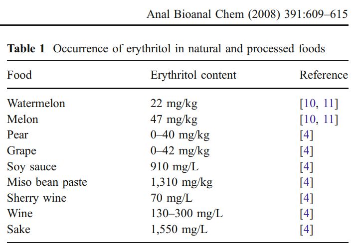아닙니다. 에리스리톨은 자연에도 존재하는 물질입니다. 미생물에 의해서도, 즉 발효를 통해서도 만들어집니다. 아래 표에서 보시다시피 에리스리톨이 많이 들어 있는 식품들은 대부분 발효식품 (사케, 미소된장, 간장, 와인)입니다. 산업적으로 생산할 때도 효모의 일종인 Moniliella pollinis 같은 균을 이용해 발효해서 만듭니다. 그런데 왜 네이처 메디슨이라는 엄청 유명한 저널에서 논문 제목에 인공감미료 (artificial sweetener)라는 단어를 사용하게 두었는지 이상합니다. 물론 리뷰어들이 식품과는 상관 없는 사람들이어서 그랬을 것으로 추측합니다만. 정확하게 말하자면 인공감미료가 아니라 설탕대체제 (sugar substitute)라고 해야 맞을 겁니다. 물론 천연적으로 존재한다고 해서 안전하다는 이야기는 아닙니다.