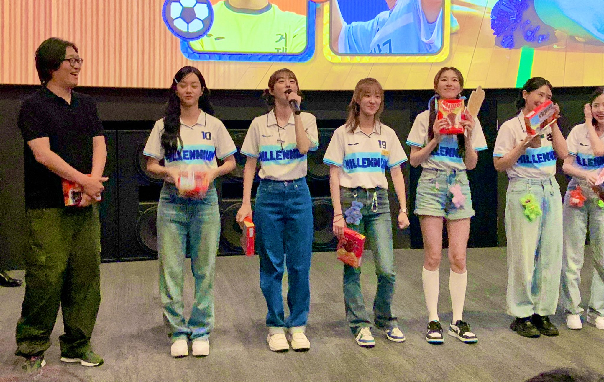 생각보다 영화가 좋아서 아내와 함께 한 번 더 보기로 했는데, 저희 동네에 무대인사가 있다고 해서 배우분들도 함께 만날 수 있었네요. 영화 속 응원부 "밀레니엄 걸스" 9명이 완전체로 다 인사를 다니던데, 영화에서 그랬던 것처럼 너무 사이가 좋고 즐거워보여서 더 흥겨웠습니다. 게다가 첫번째 봤을 때 가장 인상깊었던 태권소녀 상미역의 염지영 배우님과 함께 기념사진을 찍는 영광까지!!!
