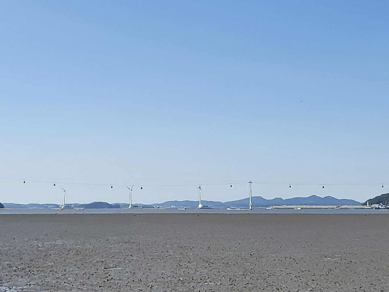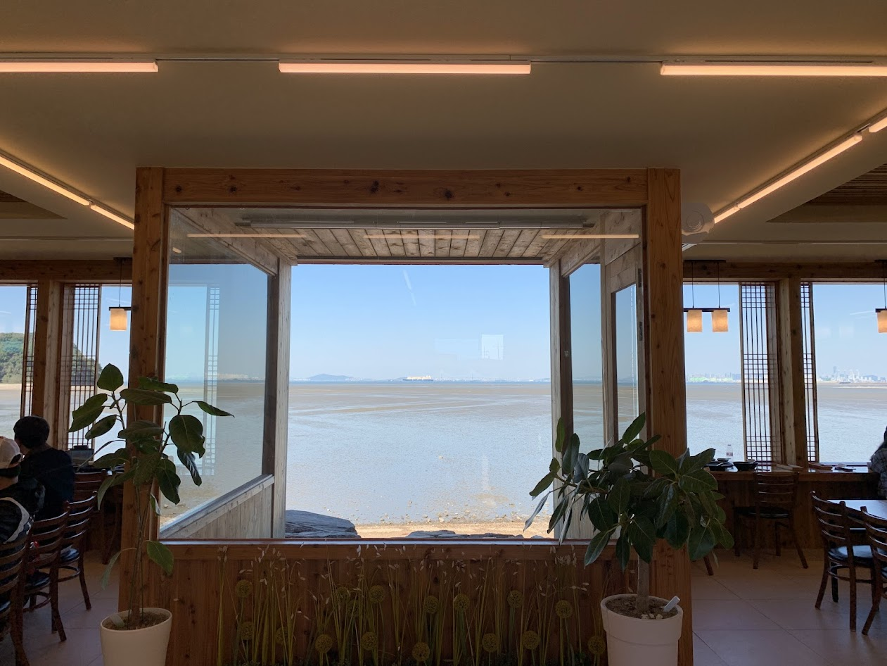 감사하게도 2인석 한 자리가 비어서 앉았습니다. 다만 아쉬운 것은 간조시간이어서 바다가 아니라 뻘이 보인다는 것.